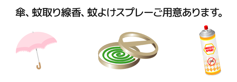 ・ヘアドライヤー(2台) ・ミニキッチン(ガス) ・箸、スプーン、フォーク ・BBQ機材 |